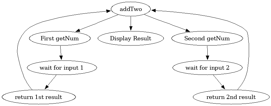 Here we have two modules going, and in fact you may want to split this into two scripts. All this program does is prompt for a first number, then prompt for a second number, and then show the sum. Very boring, but lovely for pointing out some features. Lets go by way of execution-flow.